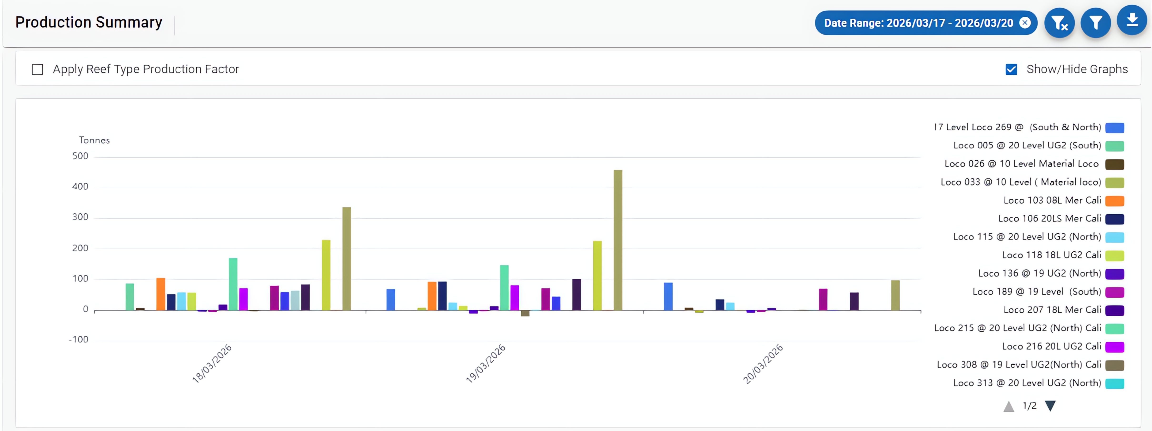 Production reports - Detailed tonnage by level and section, hopper payloads, and hourly production figures.